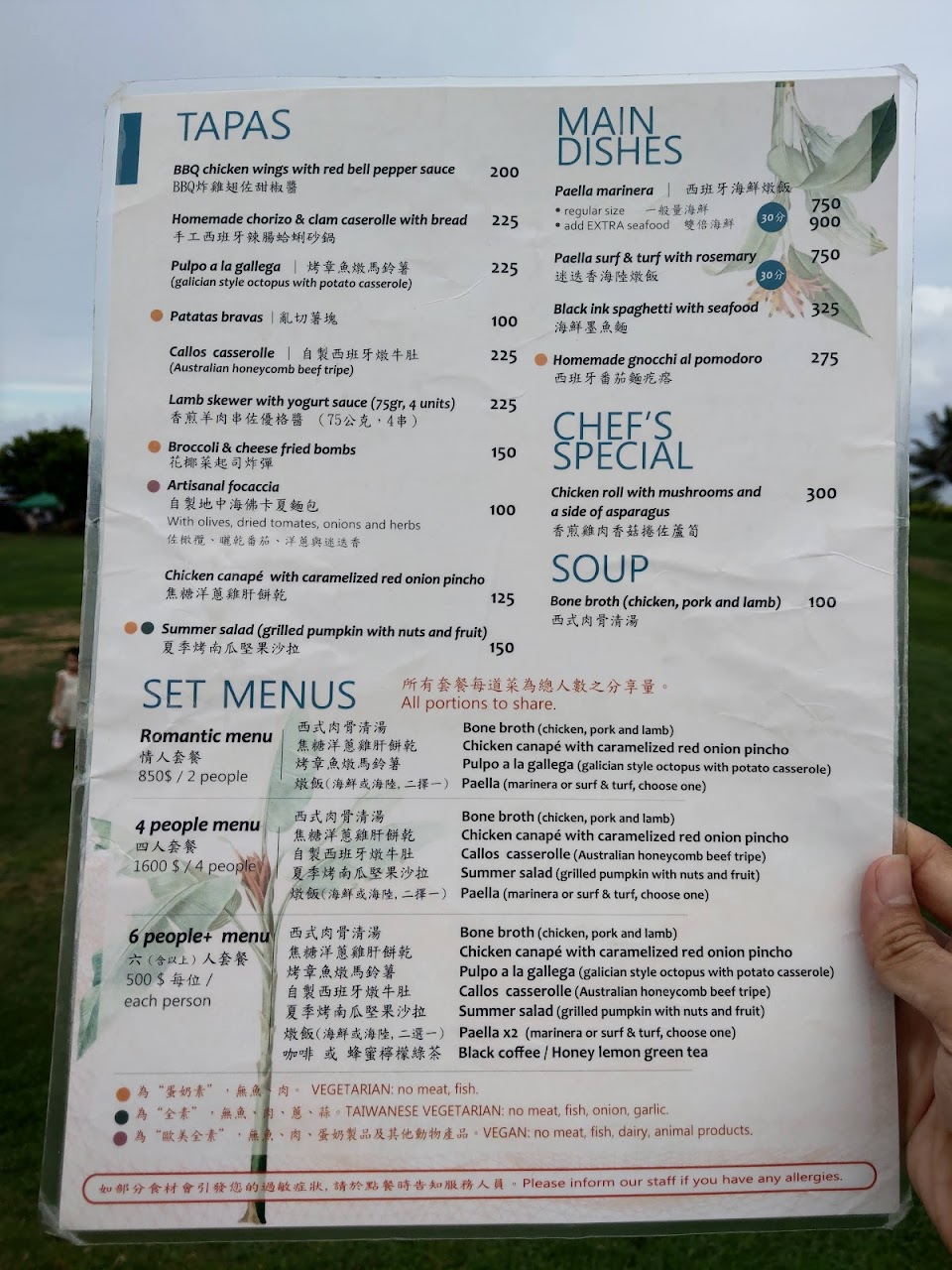 愜意的餐廳,供應西班牙料理、咖啡和酒精飲料,並有可俯瞰大海的寬闊草坪。
