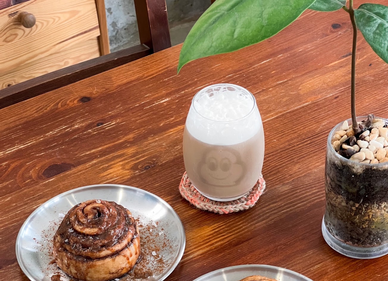 路過看到肉桂捲牌子,忍不住停車來試試,意外發現很棒的小店,店內環境乾淨舒適,搭配很多綠植? 綠意盎然,戶外還有一個木頭座位區,可以脫鞋上去坐,有軟骨頭可以半躺著在這慵懶一下,一邊享用下午茶,真是令人愉悅!