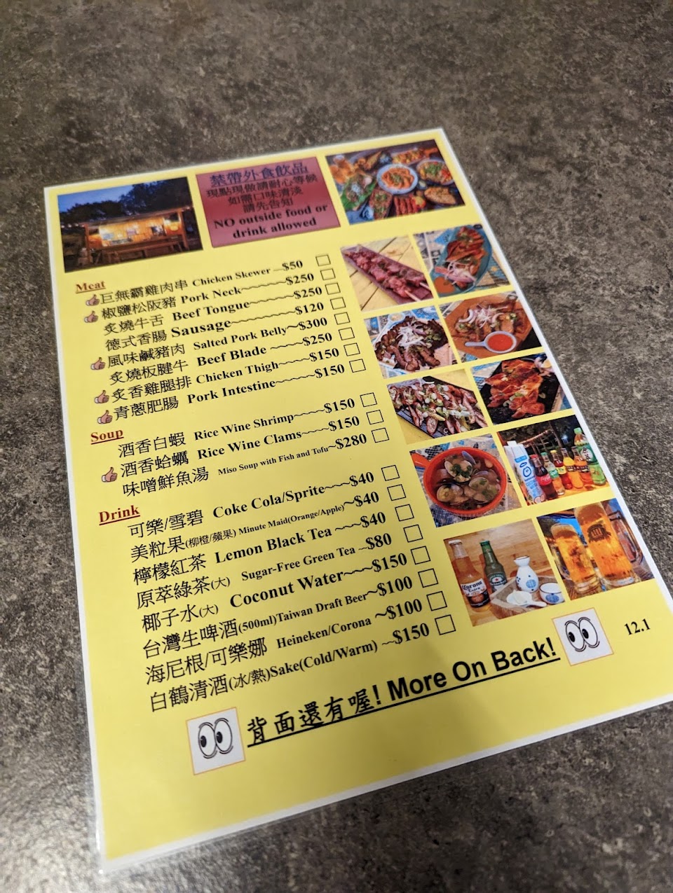 跟預期的戶外燒烤不太一樣,空間有點小,而且品項蠻少的,可以想像成戶外有頂棚的居酒屋。