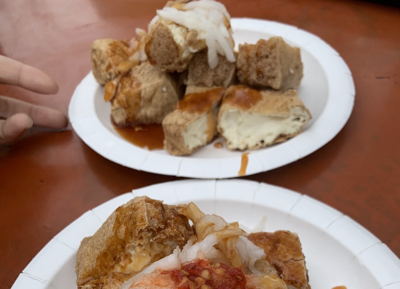 這兒的臭豆腐,不是臭,是用嫩豆腐(像雞蛋豆腐),外皮酥香,搭配辣蘿蔔,而豆花也是非常的好吃。
