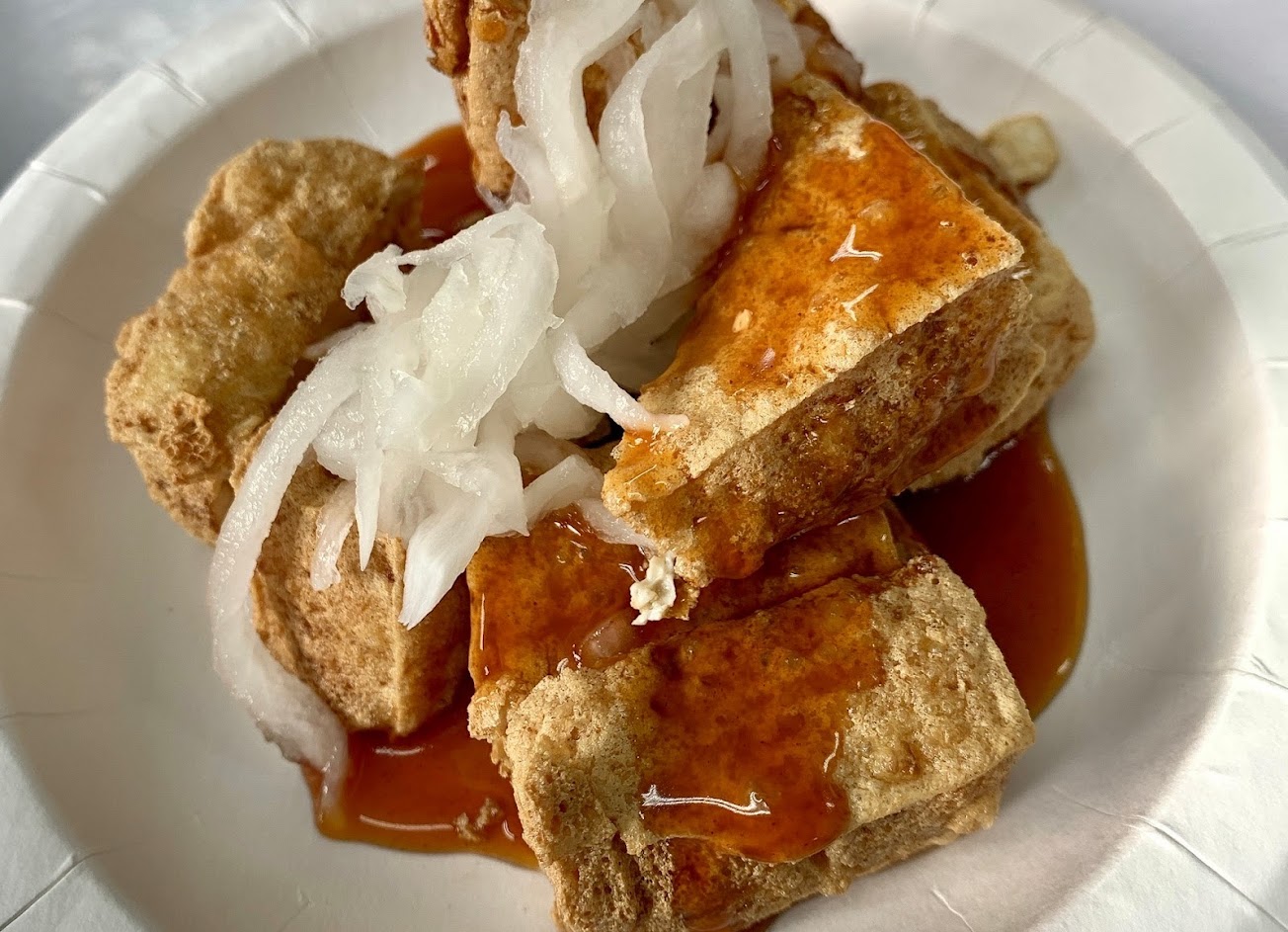 炸豆腐微辣,習慣吃辣的人可能會覺得不辣,辣醬只有淋在某片豆腐上。