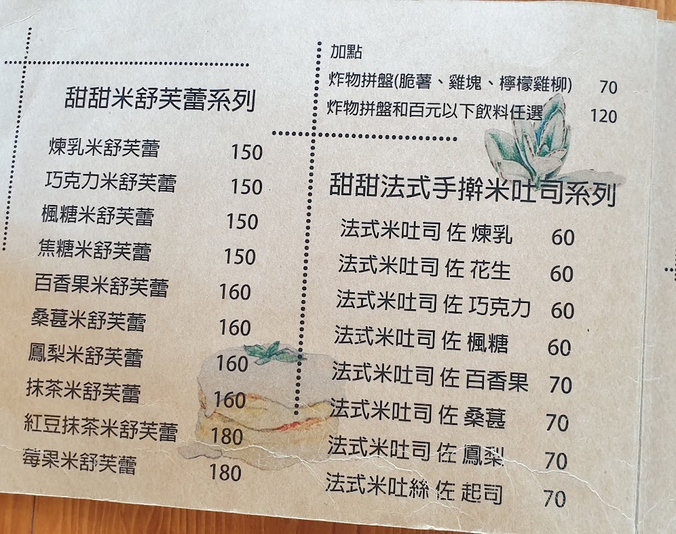 餐點明明有調整價錢但菜單卻沒有更改或是告知,然後餐點也還好,炸雞塊感覺裡面爛爛的,薯條好吃!舒芙蕾感覺沒有到很驚艷…很像沒有發起來的發糕….整體太甜容易膩