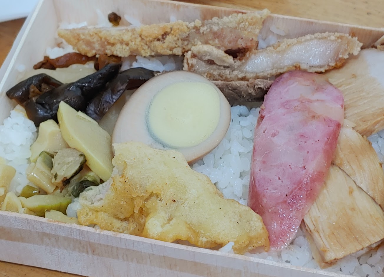 我們現場買現場吃,便當跟飯都是溫而不熱,肉片很柴、油炸包肉條的那個軟軟,也不好吃。香腸一般,炸肉一般。菜只有內用自取才有