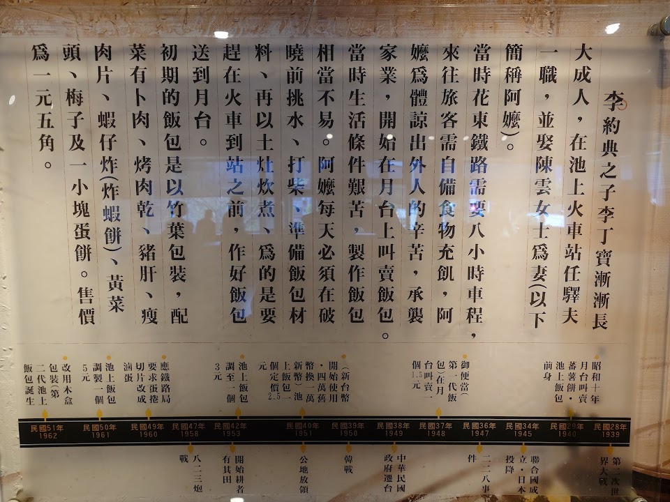 清楚介紹了池上飯包的歷史進程,雖是一個小小便當,內中卻隱含了許多故事,一樓是美味的餐廳,二樓則是文化故事館,老舊的擺設,營造出古早的氣氛,使我不禁憶起童年,玻璃櫃中的便當擺設,詳細說明了每一道食材的代表意涵,以及其製作流程,內中還展示了每一代的池上便當,特別表現了每一代食材的差異。這裡不僅是美食的集聚地,更是拍照的好去處,一經此行,更讓我了解到一個便當的不凡,池上便當的特色不是只有池上米,還有製作便當的人之用心,文化故事館讓我對平常在吃的池上便當,有了更深切不同的認識。