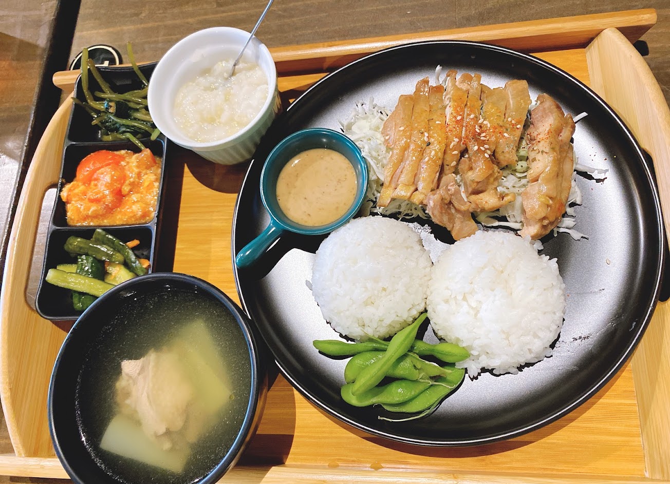 今日點咖哩唐揚定食 店家除了主菜咖啡唐揚雞肉外, 會配上三道青菜及一份湯品 今日上菜前先給一份用雞湯熬煮的粥,口感清爽不會過鹹 咖哩唐揚,咖哩部份較淡且水,非濃郁型咖哩,唐揚雞肉部份口感偏乾 店家生意很好,可以先訂位