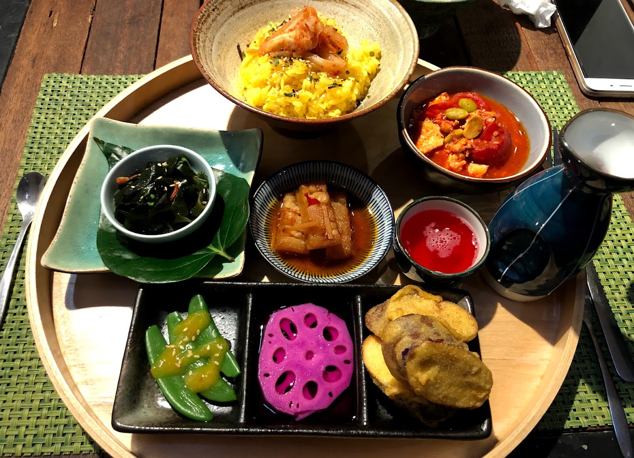 前菜的沾醬都是新鮮農產品手作的,現炸的茄子外皮酥脆內香軟,蓮藕參和紅龍果汁非常清甜,菇菇海帶湯感覺是泡菜湯底,微酸辣,每一道都很精緻。
