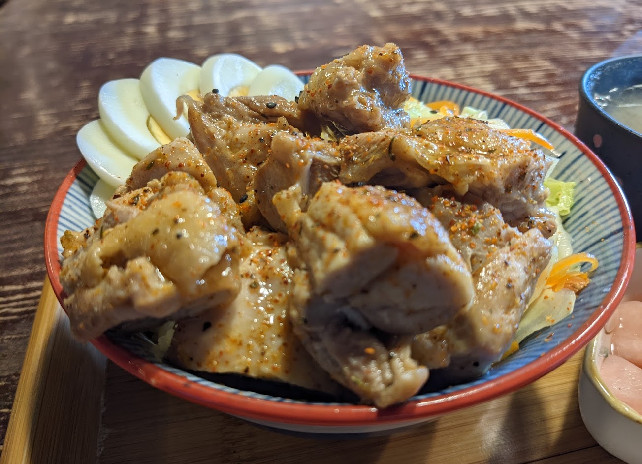 *主餐點只有5種,米飯很Q且粒粒分明,會配一顆半熟荷包蛋、些許高麗菜,小菜是醃蘿蔔,湯是味增湯,裏面配的不是豆腐是豆皮,雞肉煎的很香也嫩,櫃檯有大蒜油,加一點真的很香!但嘴裡的味道有點重,各自斟酌食用。