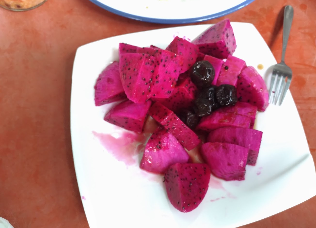 用餐可以先預約,婆婆才可以預先準備食材。米布丁吃起來類似客家水粄的口感,搭配水果很清爽。