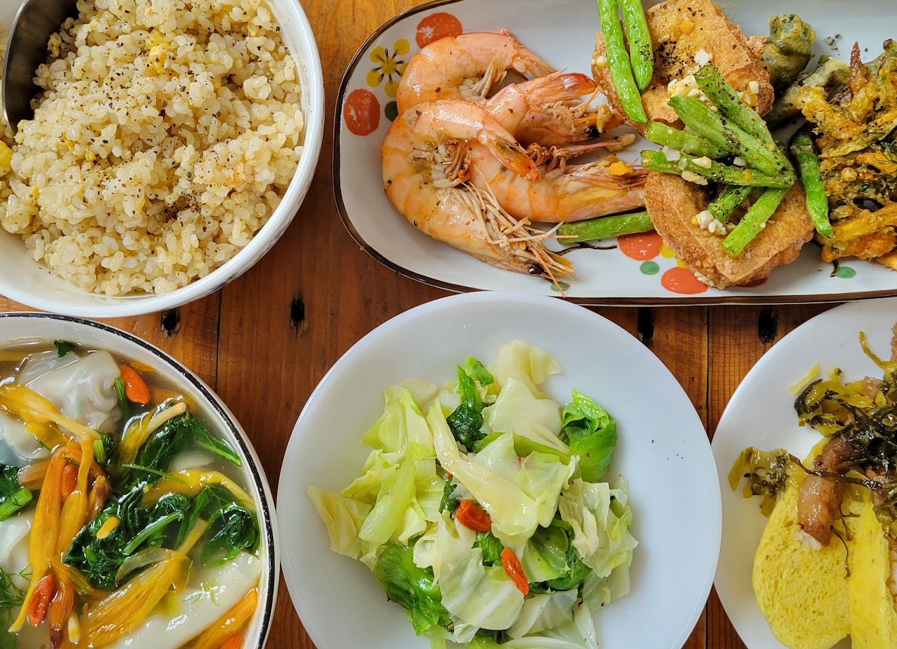很喜歡野菜餛飩湯、鹹蛋炸豆腐、炸木鱉花、菠蘿蜜蜜餞,但糙米炒飯當天吃有點冷掉,白斬雞的肉質略粉,炸糯米椒有一點苦味。