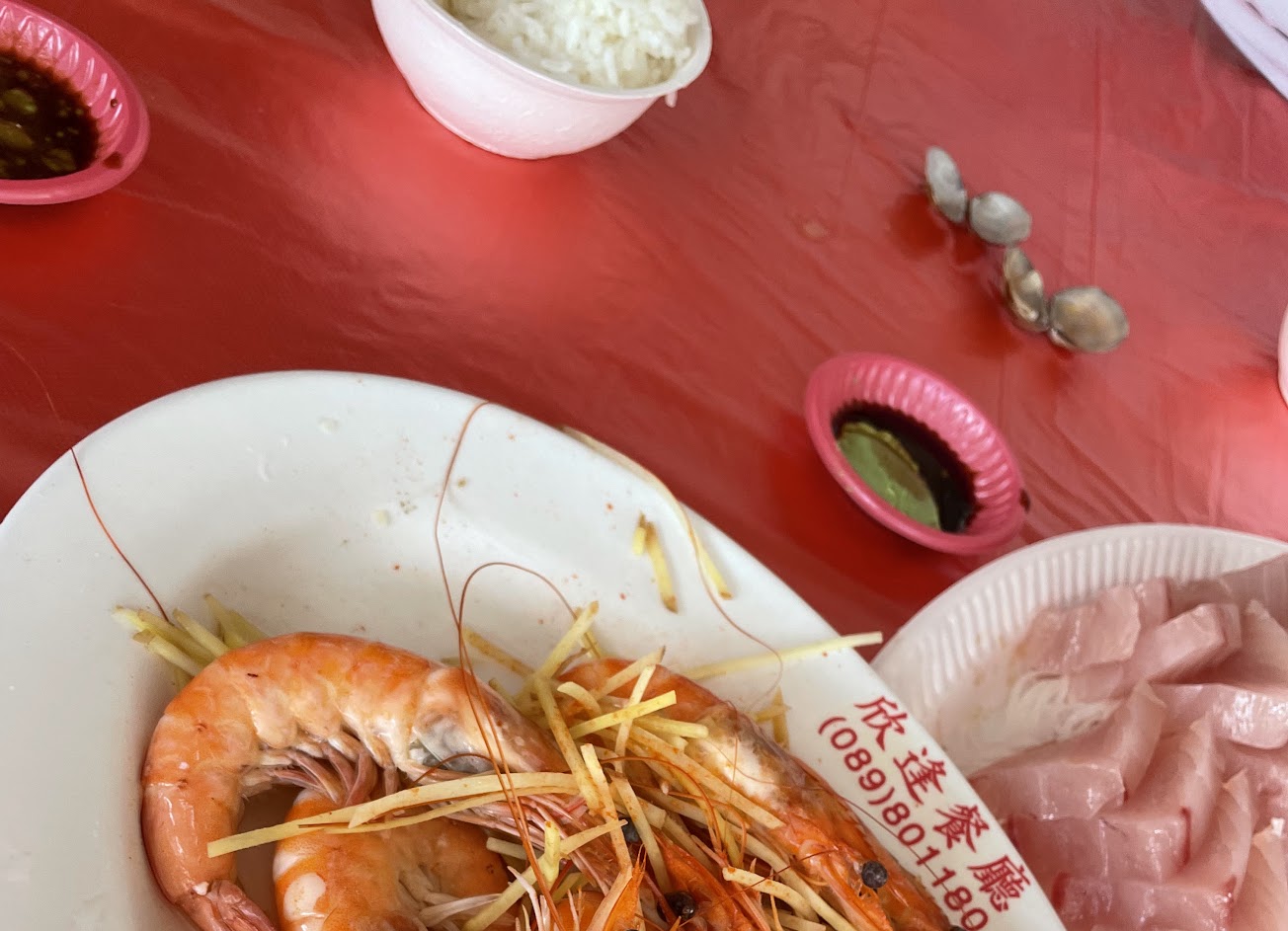 生魚片跟清蒸貢仔魚都很新鮮 蝦子來自附近養蝦場的蝦子 只用燙的吃得到蝦子的Q彈跟新鮮度 這樣總共980