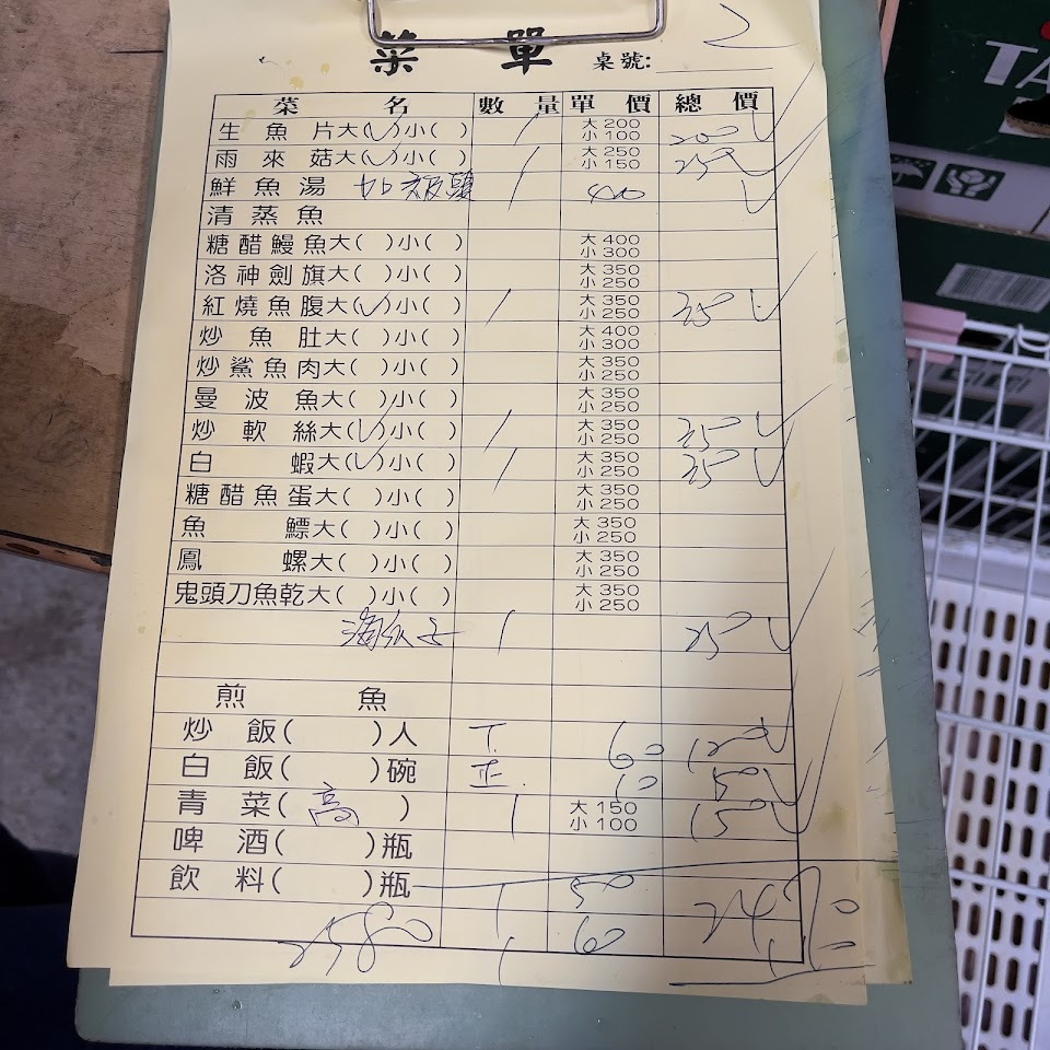 先跟門口看似臭臉其實是寡言很酷的老闆點完菜才能進餐廳,生魚片魚湯新鮮好吃,沒點太多菜是因為沒來過看不懂菜單,面對燥熱天氣站在外面的服務人員不敢開口問,下次路過還是會選擇跳過!