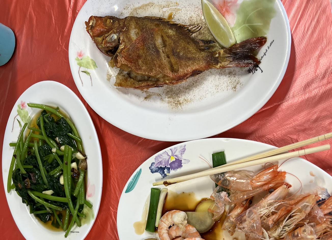 沈默了三秒,我們隨便點了幾道菜,得到了 充滿滿滿沙子的海瓜子、 冷冷冰冰的雨來菇、 小份的生魚片、 非常標準的地瓜葉、 跟非常詭異的氣氛,要不是住在旁邊民宿,我們會多備好滿漢大餐或阿Q桶麵的⋯