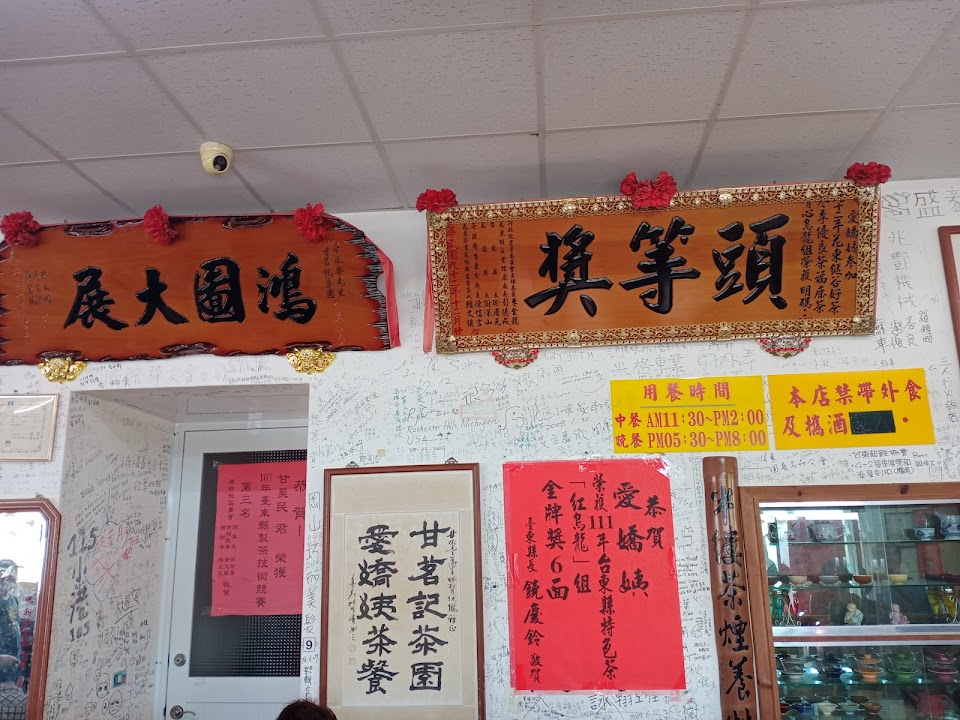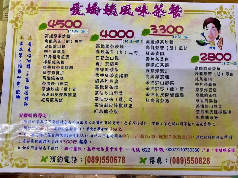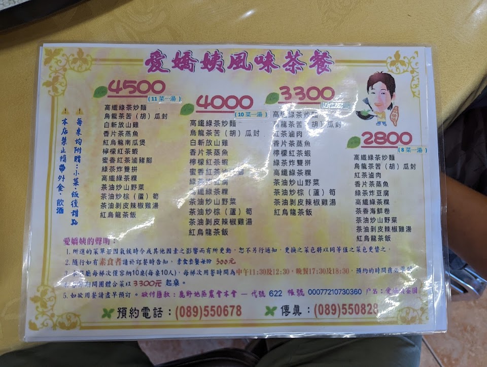 老闆超熱情一直再招呼每桌客人,一坐好就上綠茶粿,店家是以人數還有不同價位的桌菜方式經營不是單點。但每道料理都以茶入菜真的很有特色~上菜速度超快老闆還會穿梭在其中幫每一桌加特製辣椒醬,綠茶炒麵麵Q彈淡淡的綠茶香很有特色,紅茶滷肉也讓大家讚不絕口,肥瘦滷的恰到好處。每道料理份量非常足夠很適合帶喜歡茶的長輩來品嚐!店家的另一邊還有老闆娘在泡茶讓大家品嚐鹿野特產紅烏龍茶。很推薦看完熱氣球安排來吃晚餐!