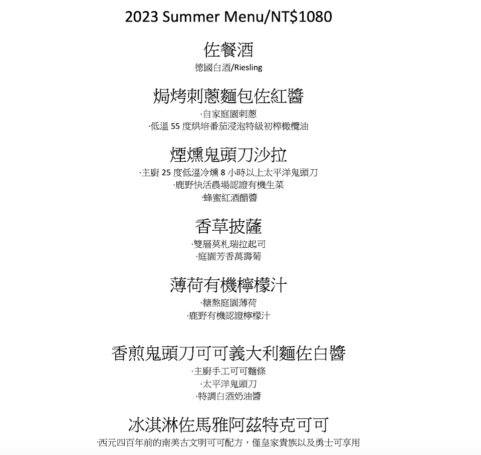 套餐菜色會隨當季農產和主廚心意更換。雖然只有單一套餐,但可以嚐到多種不同的風味食材,份量也恰到好處。要預先訂位,也要預付訂金。但用完餐後感覺值得。