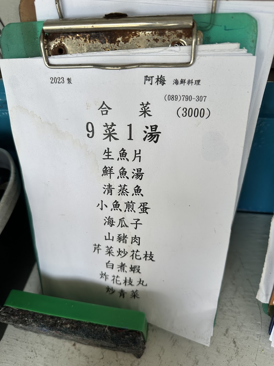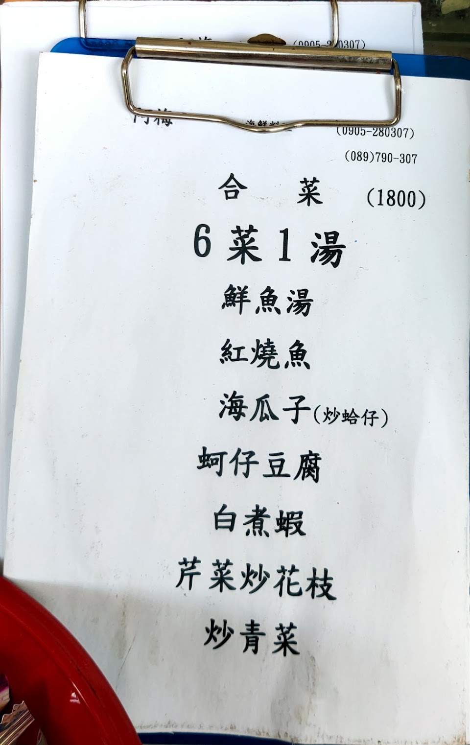 旗魚生魚片 白煮蝦 炒海瓜子 炸花枝丸 清蒸魚 炒青菜 乾煎白帶魚 芹菜炒花枝 新鮮魚湯 蛤蜊湯 煎魚