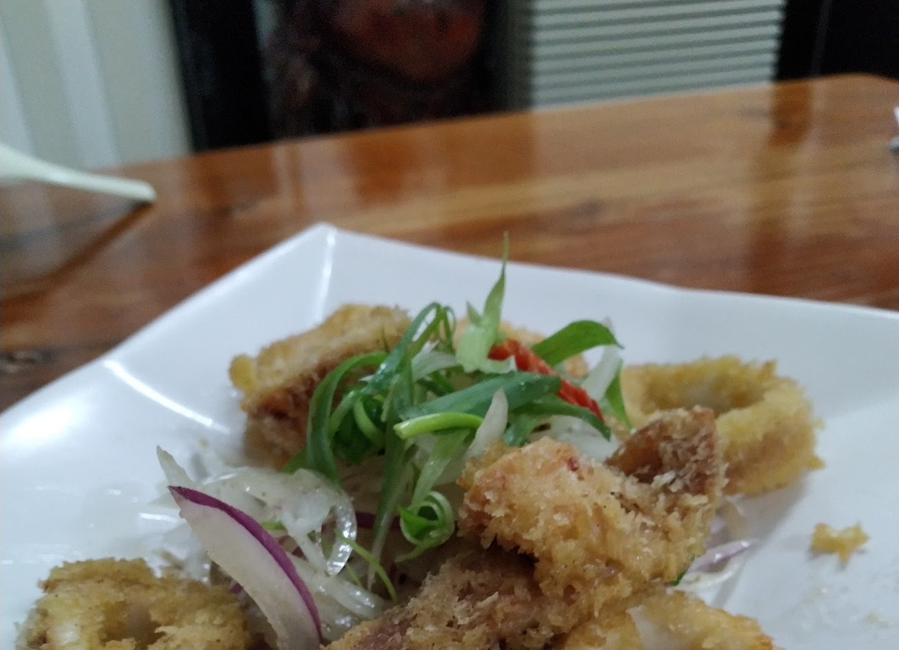 炸中卷的皮很脆,不油膩, 其洋蔥調味酸度適中,搭配起來很清爽