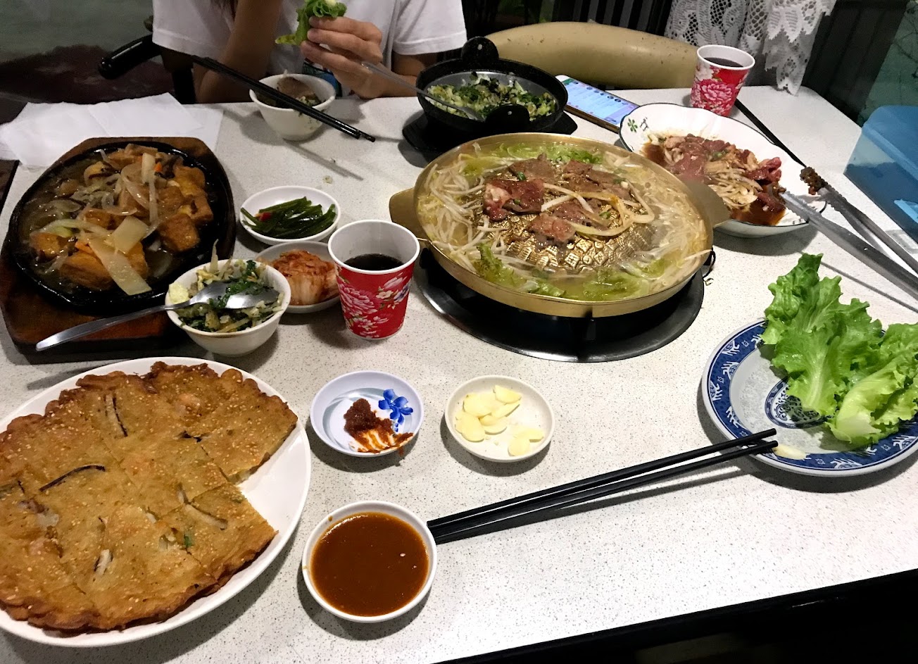 小菜可以無限續,但種類不多。豆腐鍋的味道跟統一肉燥麵很像。拌飯份量實在少,口味也一點都不韓,只有甜味。銅盤烤肉的份量也是少,但口味還不錯,不知道大家都點什麼才吃飽呢?