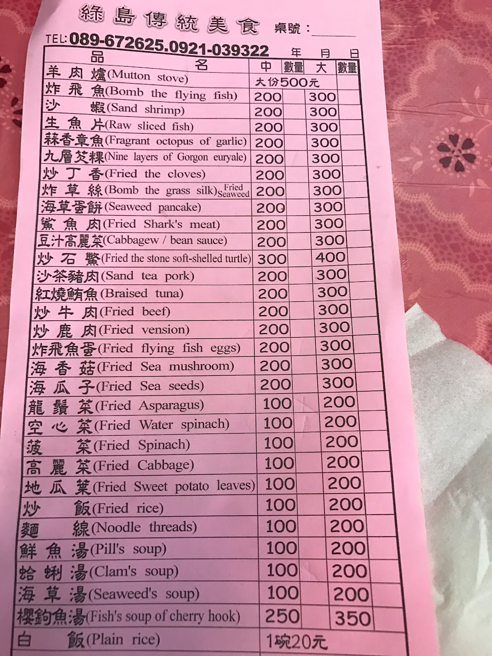 現殺的生魚片、剛上岸的高麗菜、還有阿姨的好手藝。在這一年大家的指教下,口味也做了調整,減少油、鹽,衛生環境也改善,阿姨年紀超大了但是還是很努力在經營。就算不吃羊肉爐,也要來外帶超級酥脆的九層芡粿,住在綠島的日子常常來一份就覺得很幸福。炒海香菇也很好吃!口味相當正宗,第一次來綠島可以試試看。很多節目也特地來取景:)