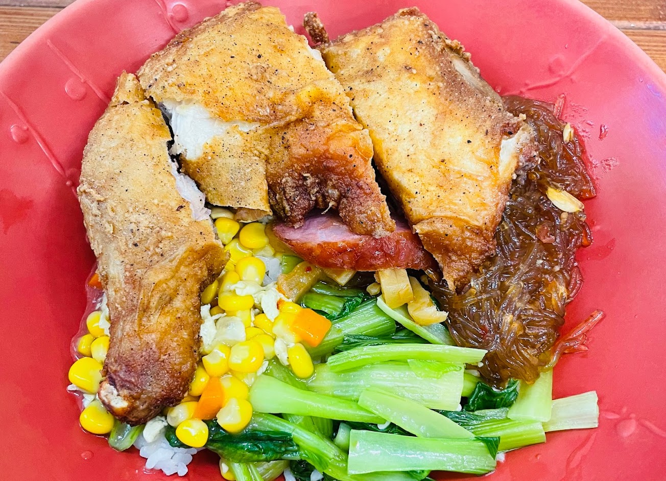 炸鬼頭刀飯真的還好,魚肉肉質老,竟然還有可怕的三色豆,三色豆毀了一切,不建議放三色豆啦!醬真的太多,很鹹,朋友說雞腿飯也還好…