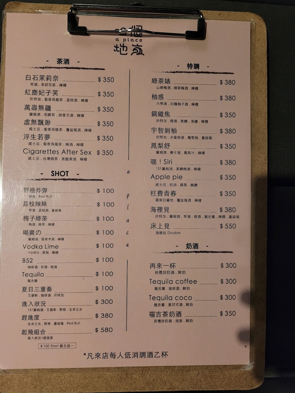 酒單很簡單:茶酒、奶酒、特調、shot和一些小點