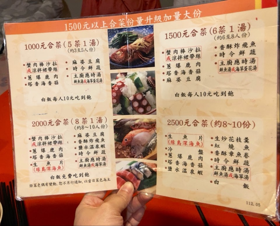 6/18三人同行唯一一起吃的一餐,三人從半夜都拉肚子拉到不行,點了1000元合菜,不推薦