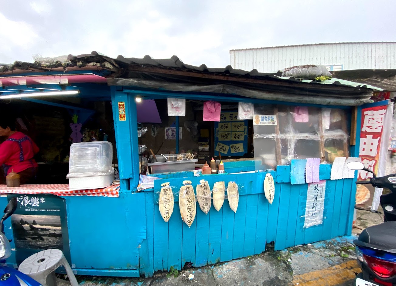 阿嬤很熱情讓我們躲雨,鮪魚口味很辣很夠味
