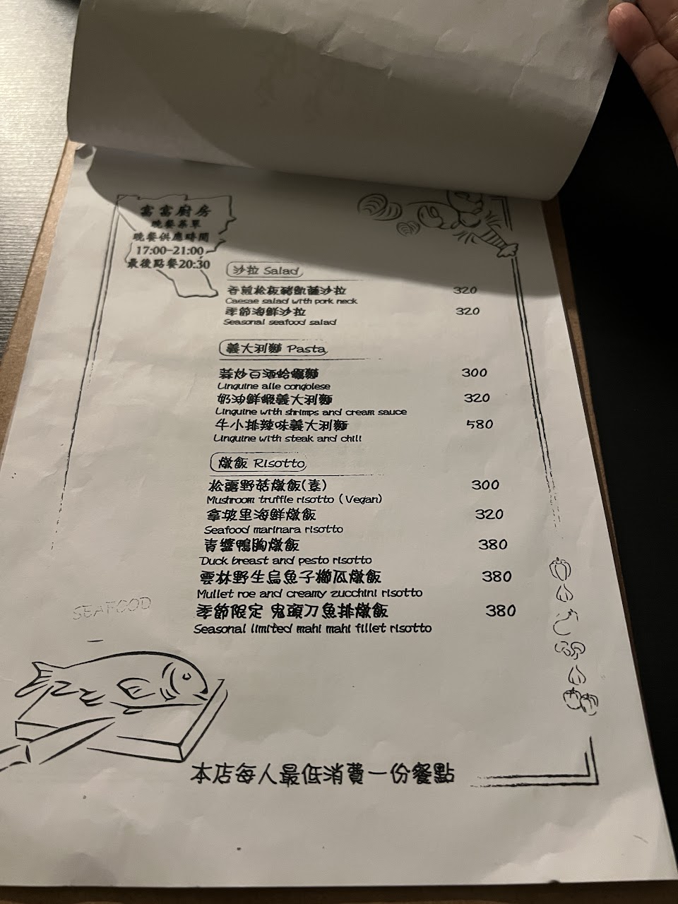 低消為一人一份餐點,店內不提供白開水,需自行購買。