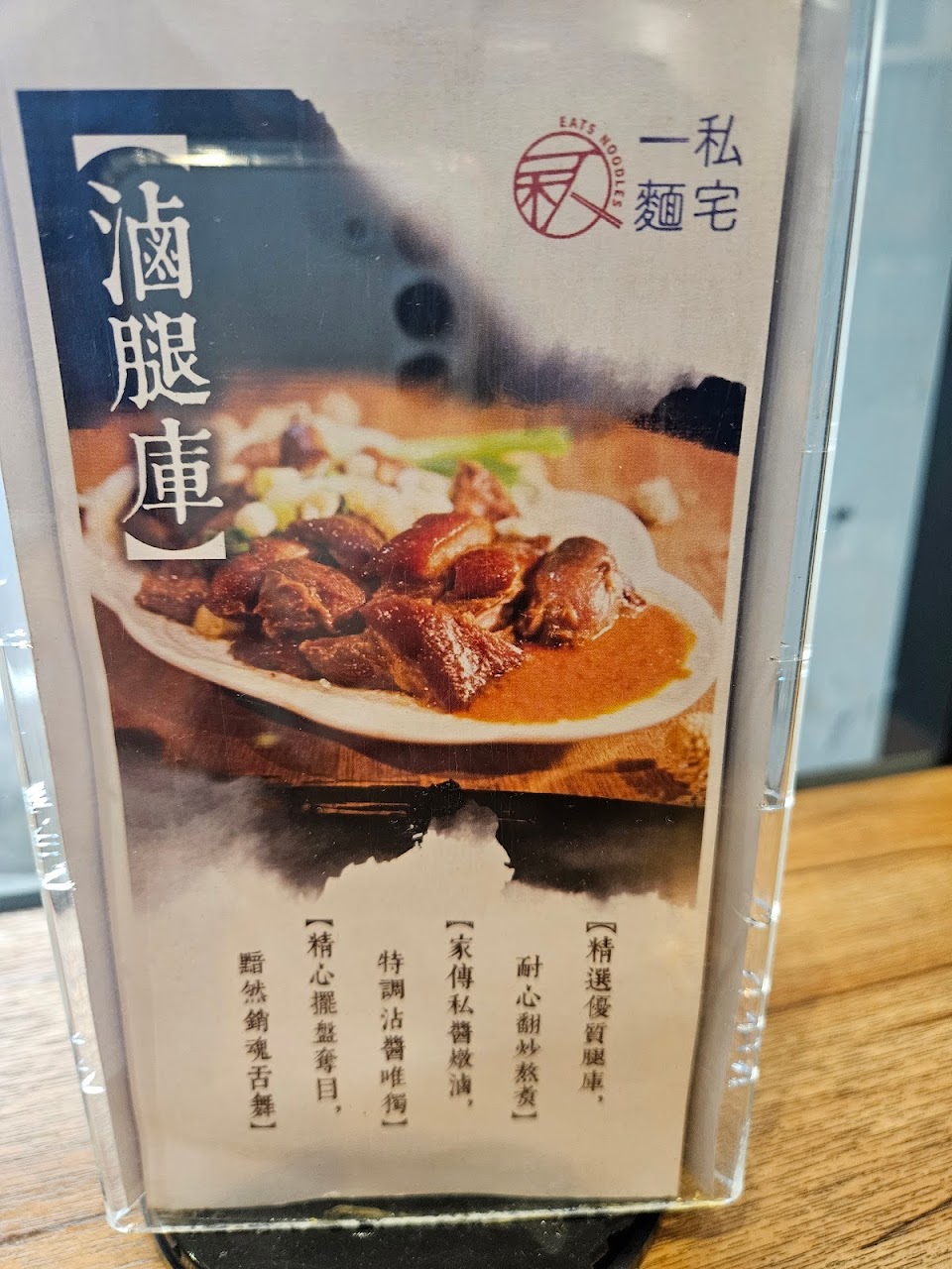今天到訪的是大溪的一私麵宅,這個地方適合騎機車來,中午的時候生意很好,整體環境舒適明亮,小菜夠味好好吃?雙醬拌麵很夠味,會想再二訪的店喔!價格整體而言算平價,腿庫肉軟嫩滑順,淋上醬汁非常入味。但可能今天生意太好,原先點了餛飩湯跟鮮蝦餛飩湯老闆沒有上。