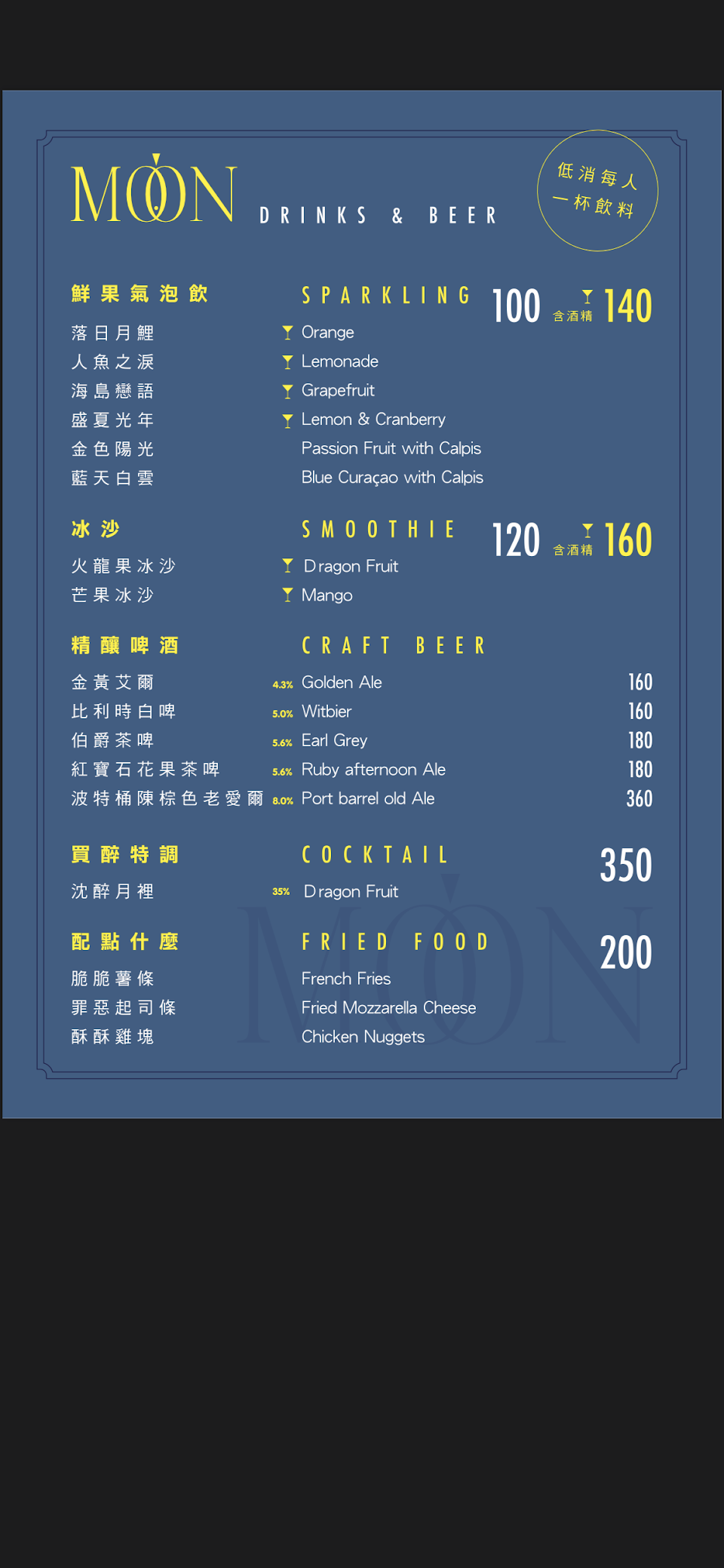 Moon有氣泡飲、水果冰沙、精釀啤酒、特色調酒、炸物。