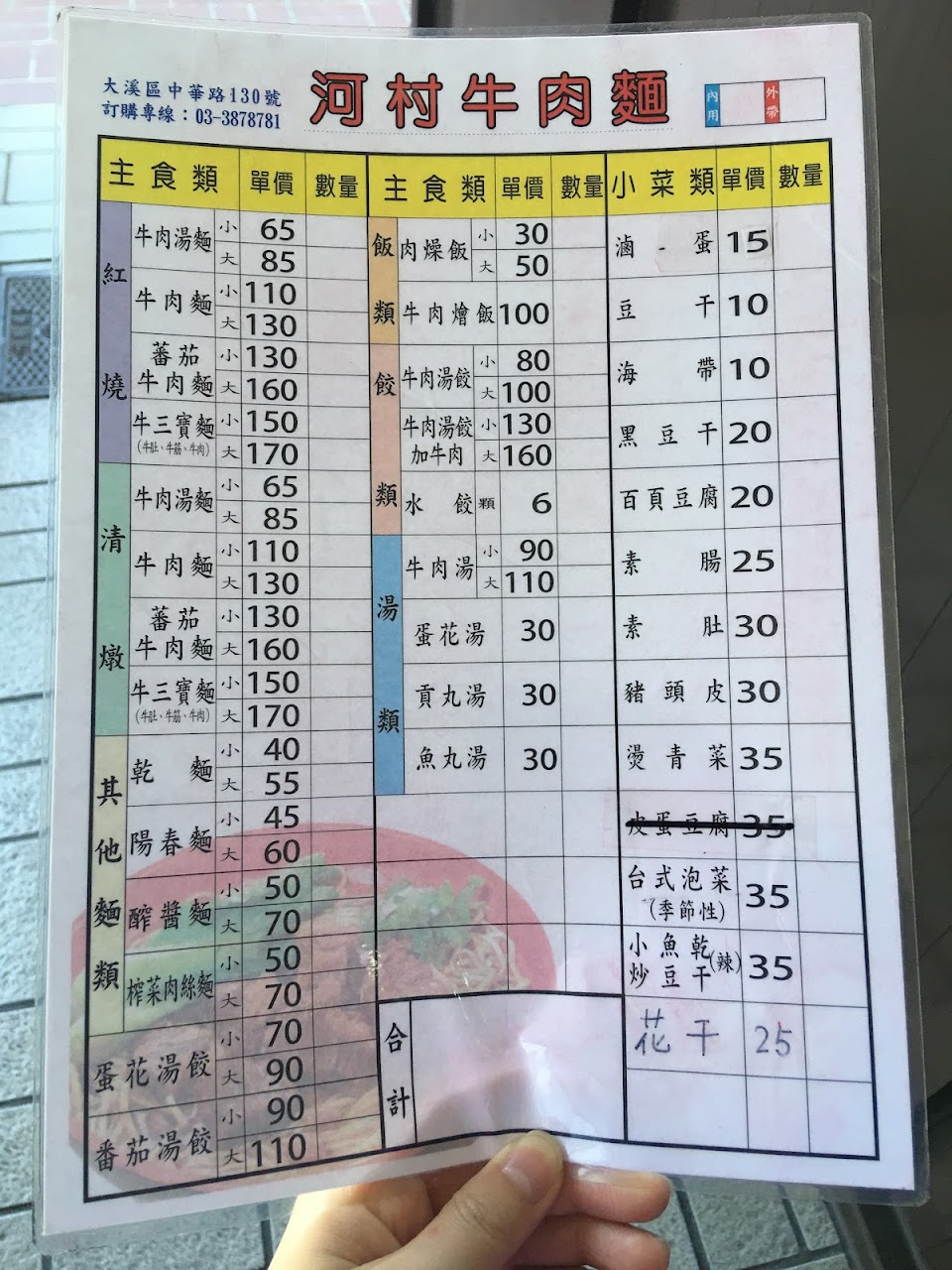 因為在附近買外套,今日來吃吃看這家的牛肉麵。由於是中午13:00左右到,店內無人用餐,我們點了紅燒牛肉麵(大$130)番茄牛肉麵(小$130)乾麵($40)。店內無開放冷氣,只有大型風扇在吹,因此在用餐時蠻熱的。牛肉麵的牛肉很軟嫩,番茄牛肉麵的湯頭有濃郁的中藥香,湯頭會一口一口接著喝,滿順口。麵稍微粗,口感Q彈。店員們都相當友善,讚?