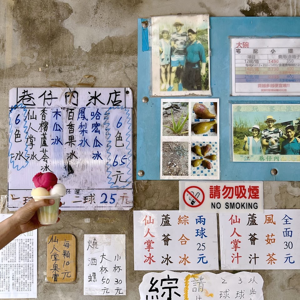 隱藏在很神秘的巷子內,一路上都有標語指示所以不會找不到,反而有種在尋寶的感覺挺有趣的。冰是綿綿冰的口感,一球不會太大,滿推薦可以直接六種口味都來一份。這次有吃到仙人掌跟蜂蜜蘆薈都超推超消暑,最重要的是價格也很親民,一球15兩球25,吃了一點都沒有負擔~這裡也有提供一些座位可以坐著吃,除此之外也有可以洗手跟廁所的地方~非常推薦來一趟喔!