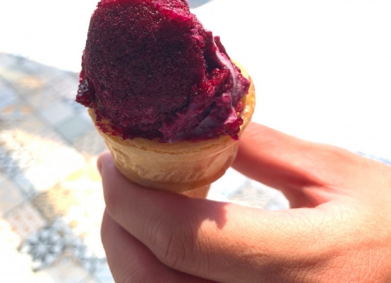 易家2球40用甜筒裝,但是吃起來更扎實,有果實般的顆粒感,會比較酸且部分有點像是冰沙帶點碎冰的口感