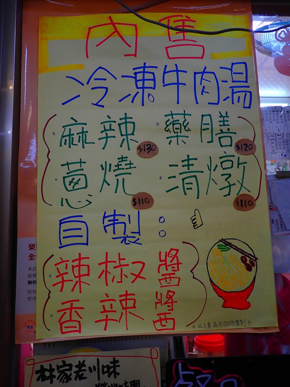 牛肉麵味道不錯,蔥燒的味道偏清淡不過很香,陽春麵偏細口感又太爛,麵的份量不多,肉和筋煮的很爛,不過爛爛了反而沒有口感,而且肉的味道太鹹。大腸也是煮到太爛,不過調味好吃,份量也不算少,只是有點太鹹。花干也不錯吃。很辣的辣醬其實沒有很辣。