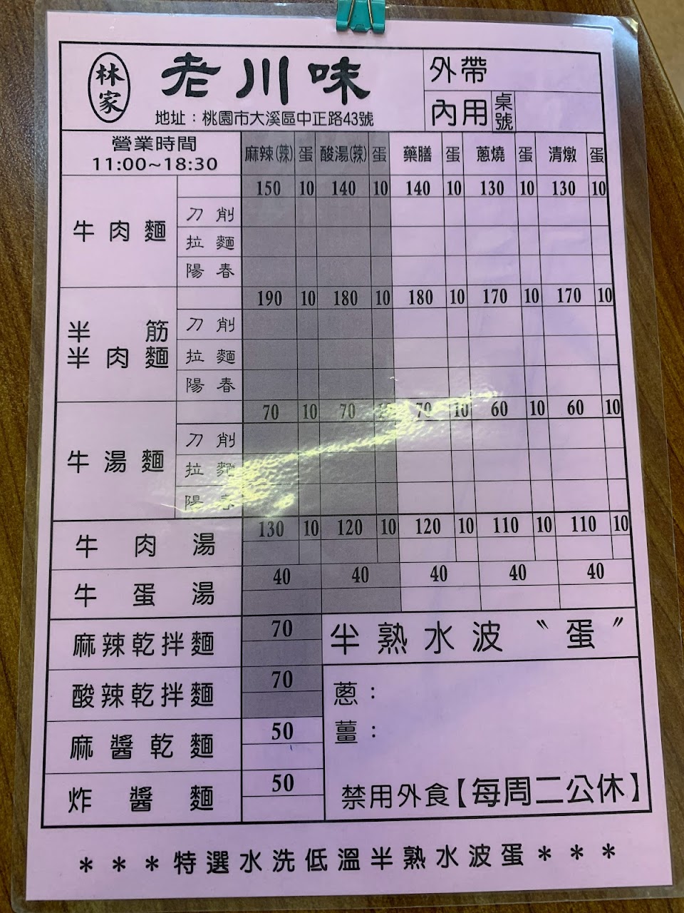 今天點牛肉麵(清燉)120元,疫情我選外帶。