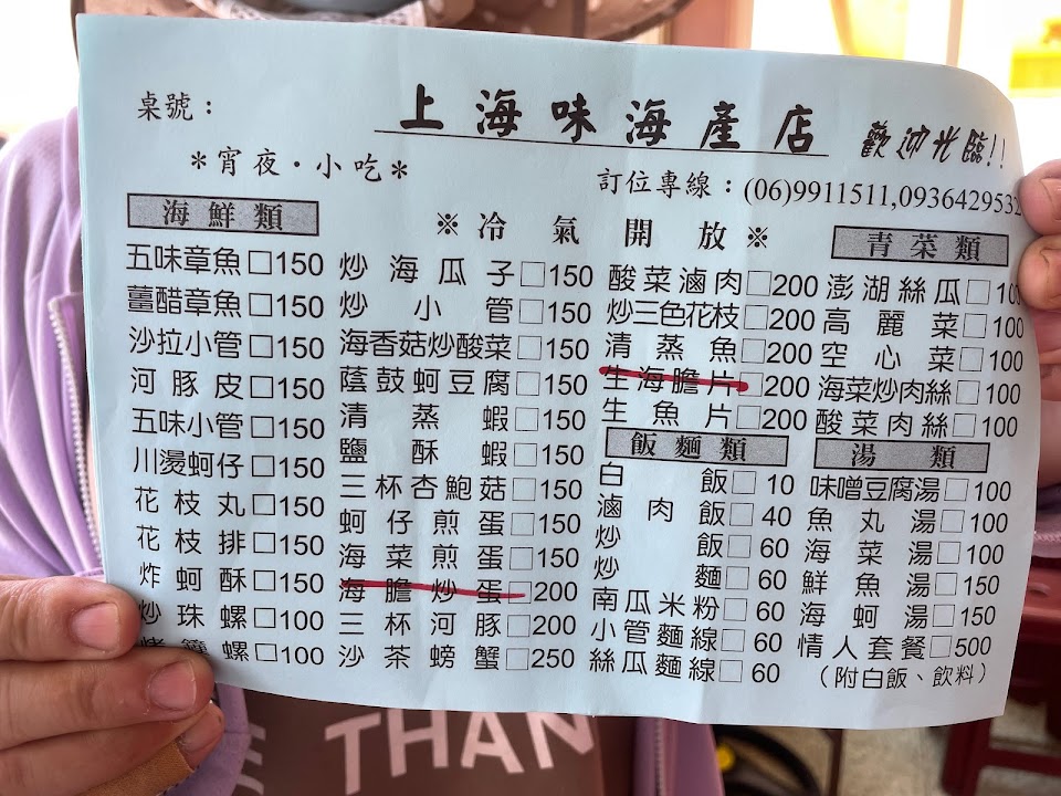 原本相信人性,請對面海豚灣冰店老闆介紹吉貝不雷的海產店,結果海豚灣老闆介紹前往,兩人吃了快一千,點絲瓜、燙小卷(真的小卷約五公分,還不新鮮)、燙河豚皮(可能放很久不新鮮)、三杯河豚(肉是溫的)、炒珠螺(沒味道)、鮮魚湯(魚不鮮),吃大概剩一半。在此聲明個人感覺不同,只是把我吃的感覺講出來,也許你會感到好吃。