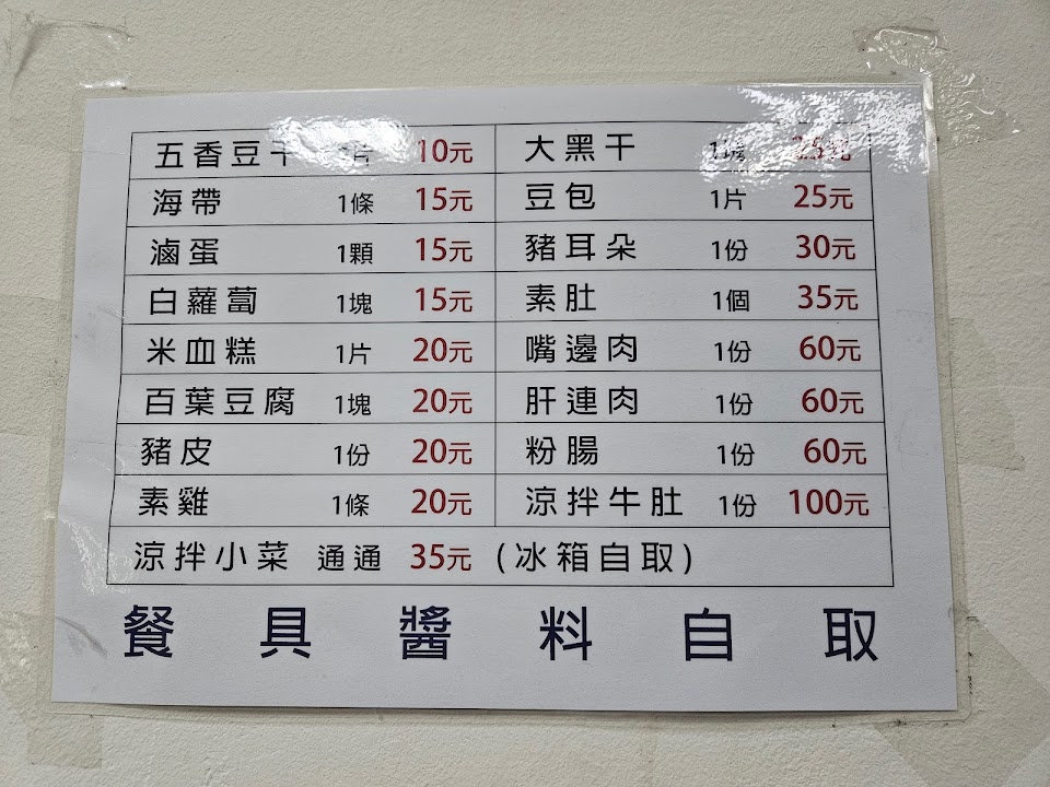 位於仁和路的路旁,招牌明顯容易找到,入內可以看見一大盤的滷味,先畫單後等吃完再買單,裡頭有免費的WIFI 可以使用,採自助式拿餐具、醬料與酸菜,記得每週二公休!服務態度不錯,上菜速度普通。