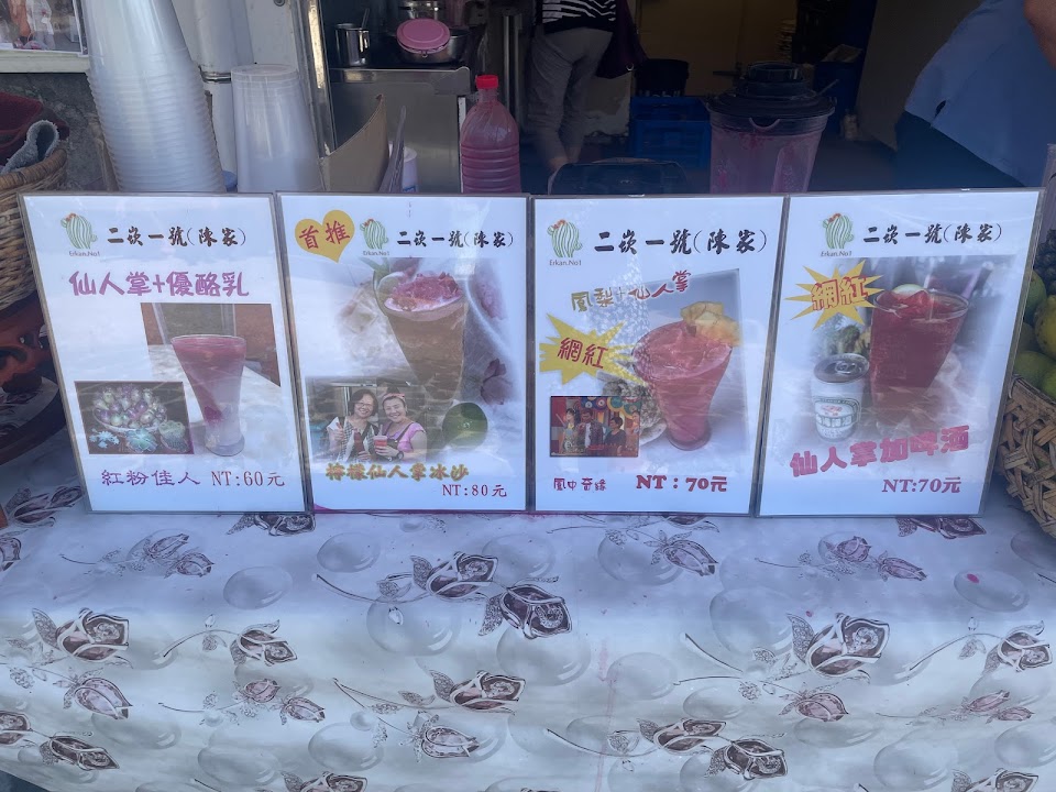 老闆推薦仙人掌鳳梨果汁(使用金鑽鳳梨,所以甜度很高)及仙人掌檸檬果汁,現點現打,一杯80元,熱熱的夏天喝一杯很消暑。老闆還招待仙人掌果實,他說果實性涼,吃太多會拉肚子,淺嘗即可。