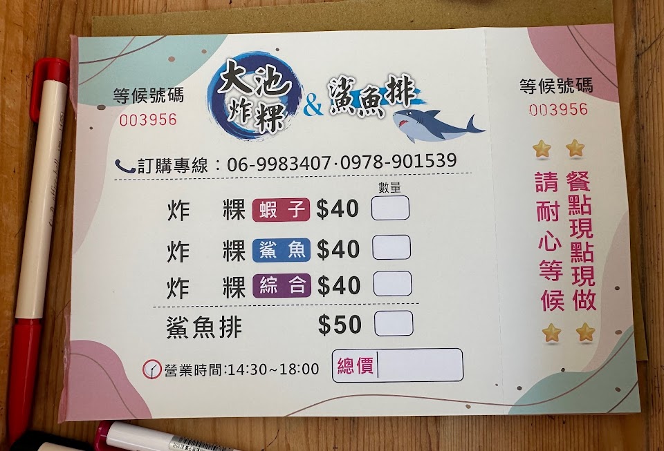 2:30開門,2:15到已經一堆人排隊。鯊魚排不到3:15就賣完了。點了鯊魚排跟蝦炸粿。鯊魚排很薄但鮮嫩,帶有鯊魚肉天然的微酸感,吃起來不會油膩。蝦炸粿很紮實,那紮實來自新鮮切粒的高麗菜。但大池相比回家,大池炸粿的高麗菜沒有先調味過,整體走的是原味係,需要多加的醬料。