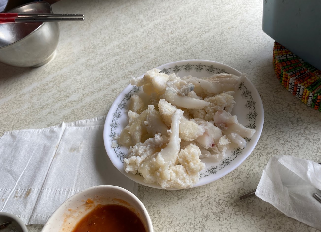 在鯨魚洞旁邊 小捲米粉湯底很好喝 麵線本身就有鹹味加上的絲瓜很有口感不會軟爛 。 另一道小管炒蛋 魷魚有些烤過 味道很重 很適合下酒菜