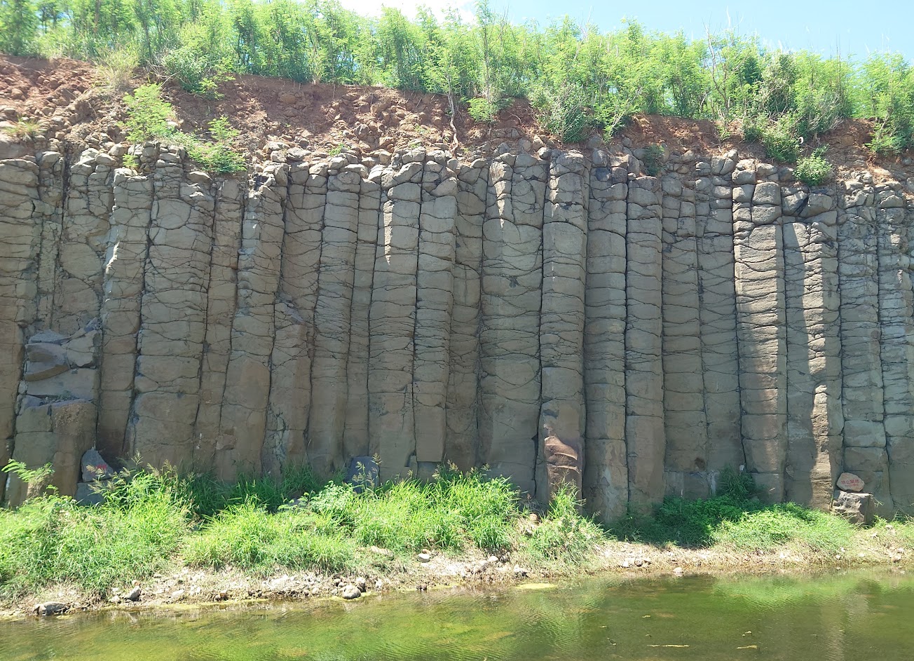 這邊的柱狀玄武岩有一大片,來訪人潮是絡繹不絕,下方停車場有全家便利商店,方便補給,停好吃走一段階梯就到了,由於有一大片,很好取景,隨便拍都好看,原本有一水池,天氣炎熱且沒下雨,水池都快乾了,若是搭配水池相信更美!
