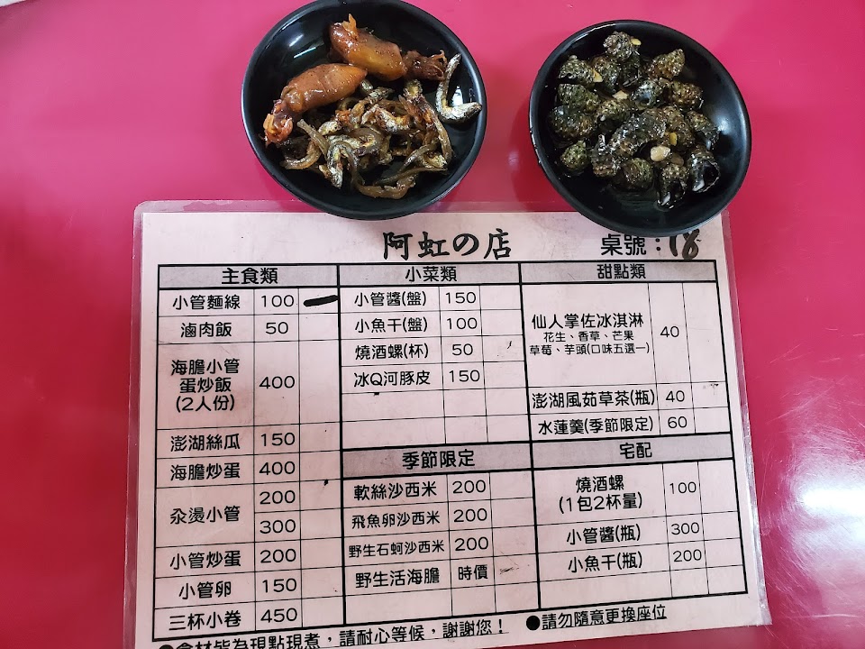 阿虹的店真的非常好吃,老闆娘很健談,開在觀光客常去的小管米粉隔壁,但這間的小管米粉也是非常美味,老闆娘總說著不好吃不用錢,但實際嘗試過才會了解老闆娘的確可以有這份自信去說這句話。炒飯可以選擇不要海膽,只要小管炒飯(100元一人份)炒的相當好吃,小管切成小碎塊增添很多美味,軟絲沙西米真的口感軟嫩新鮮好吃,最特別的是石蚵沙西米,不只石蚵新鮮沒有腥味,而且老闆娘自製的五味醬,加了醋米酒跟蒜頭的感覺,再拌上一大坨的哇沙米,雖然嗆辣但整個突然變成了不同料理的感覺,感受很新鮮特別,建議一定要點。海膽煎蛋的蛋香氣很足,但其實馬糞海膽本身就比較沒味道,再加上包在裡面加熱後也會融化,吃起來可能會稍微懷疑海膽到底在哪裡又有那麼一點貴,可是看做法裡面也是真材實料啦。小管米粉也是味道鮮美湯頭好喝,兩個沙西米,炒飯跟米粉絕對是必點料理