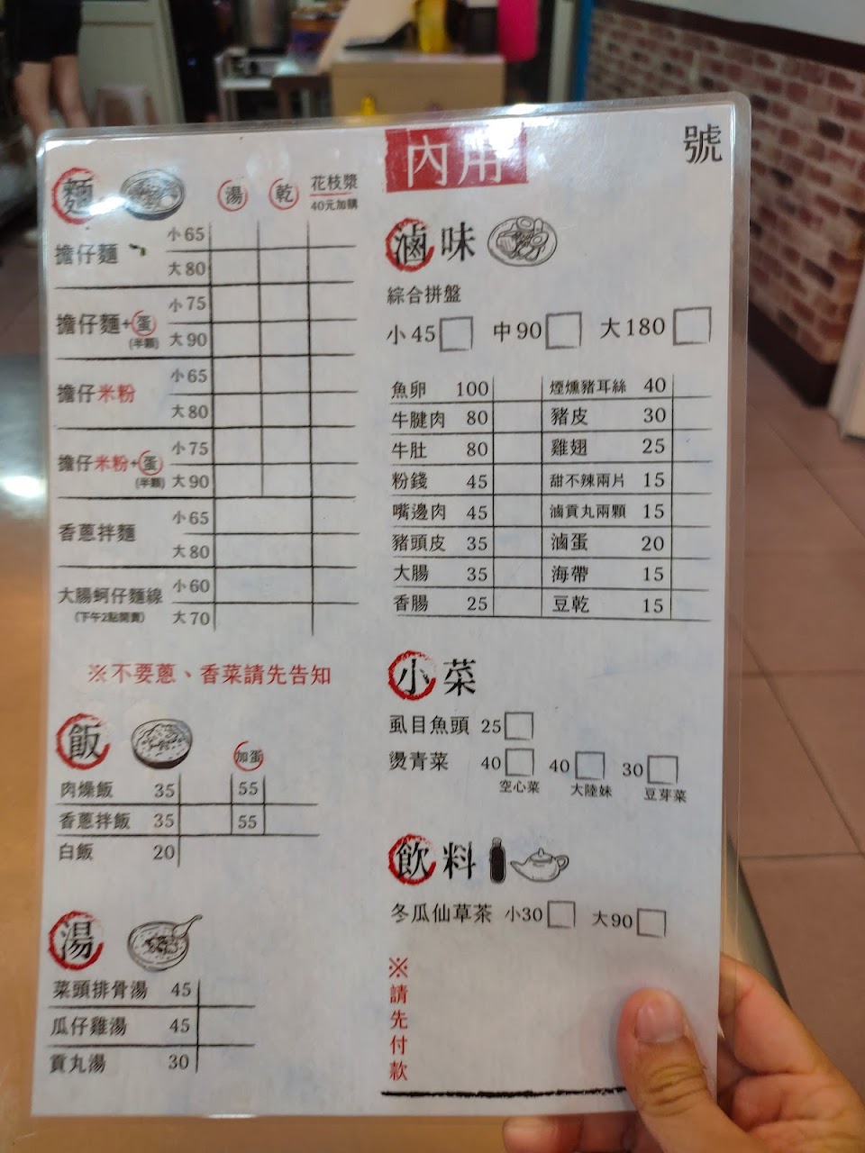 在要去看花火節的晚上 我們想了很多地方 最後選出了這家擔仔麵 就騎車過來吃了 我們剛好三人一桌 然後真的什麼都想吃 所以就想說擔仔麵平分 點來嚐鮮看看 結果剛好到我們這張單子 大腸蚵仔麵線 沒了 偏可惜QAQ 以後有機會再來吃唄