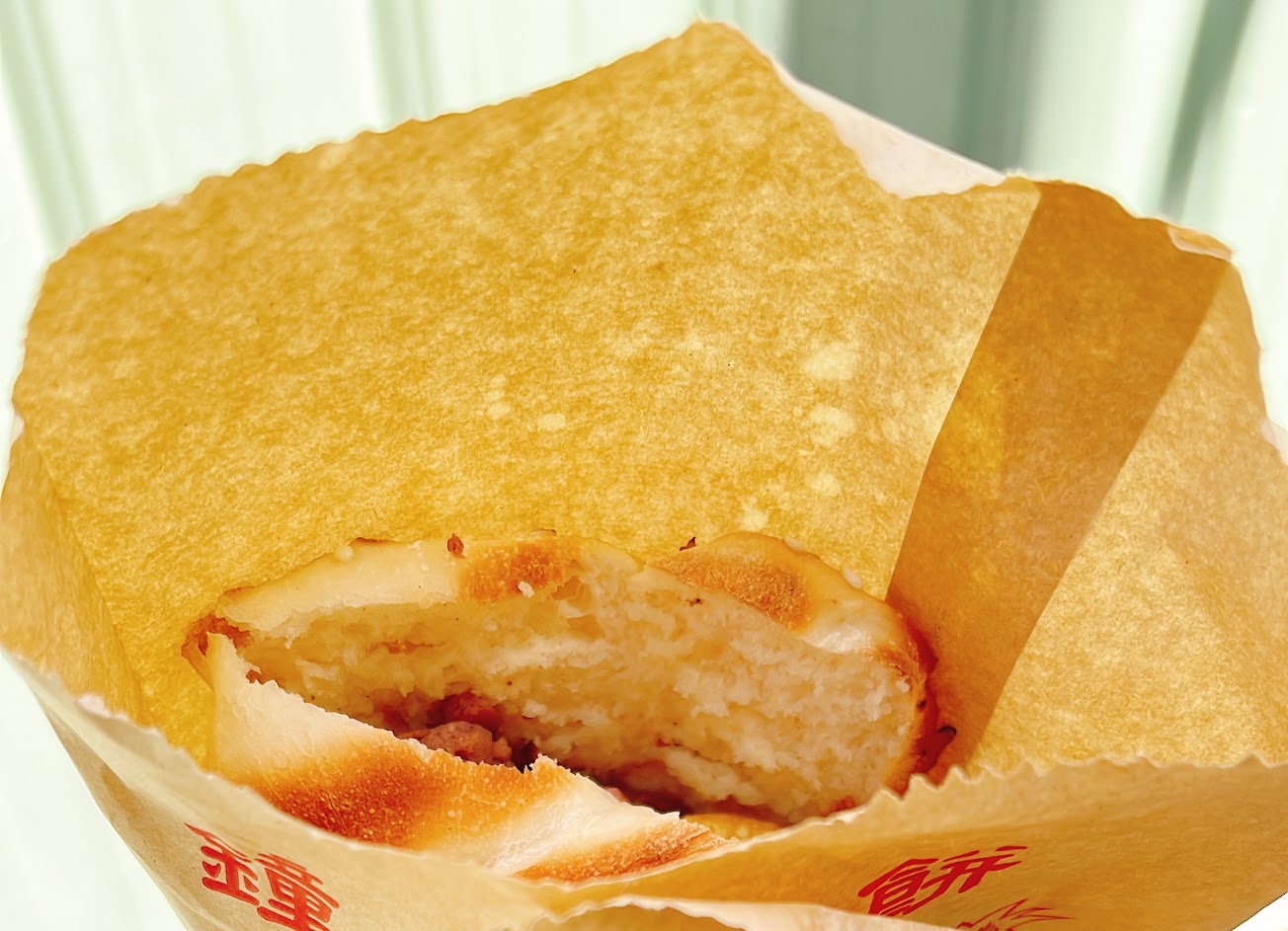 燒餅本人跟平常吃到的那種像派皮的感覺不同不會掉屑屑,而是帶有甜味的厚實麵包感,加上玉米蛋後更是美味,可惜有加蛋的就會有蔥啊!!!太失策了