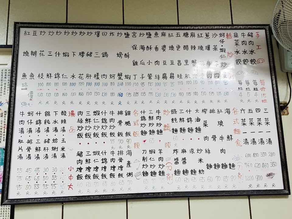 熱炒類口味還不錯,食材還算新鮮,麵飯類的價格平實,什錦麵湯頭清爽(或是說清淡),大魯麵跟什錦麵只差在勾芡,刀削麵口感非常Q彈(或是說難咬),點餐時一定要注意大小份,店家不會提醒。