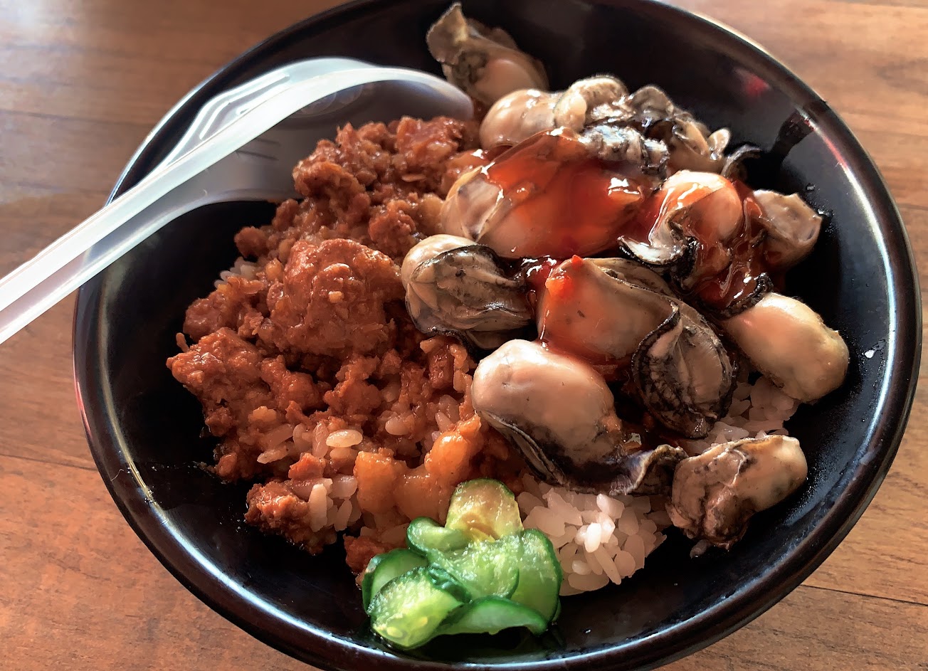 在台灣沒有吃過的鮮蚵滷肉飯,海陸精華融合在小小一個碗當中,十分過癮!
