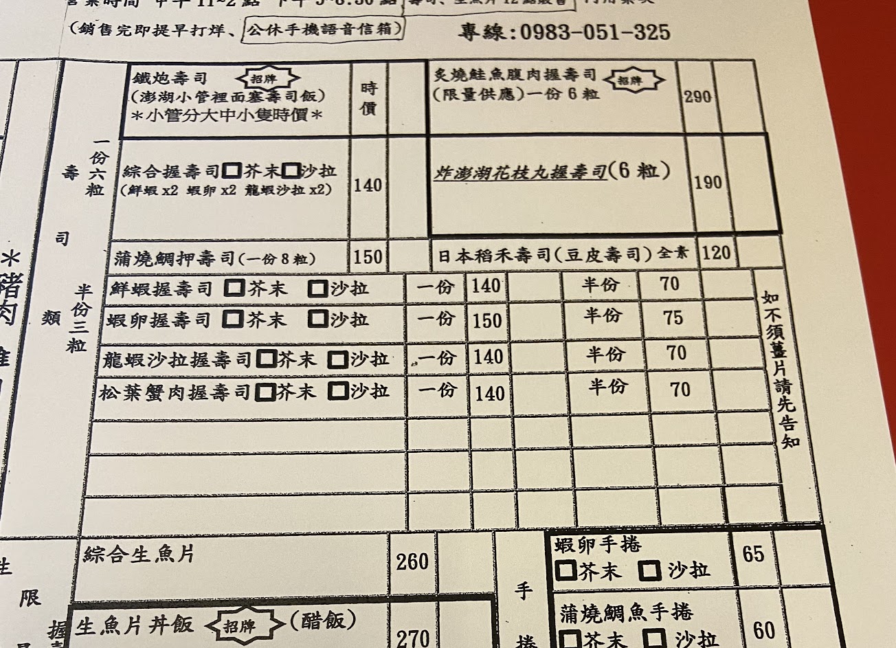 到店時已經準備打烊,店員不斷跟我們道歉,表示準備打烊無法接待,並熱情的給我們菜單參考希望我們隔天坐船前可以再來用餐,服務態度先給滿分,下次有機會來澎湖肯定再來用餐!