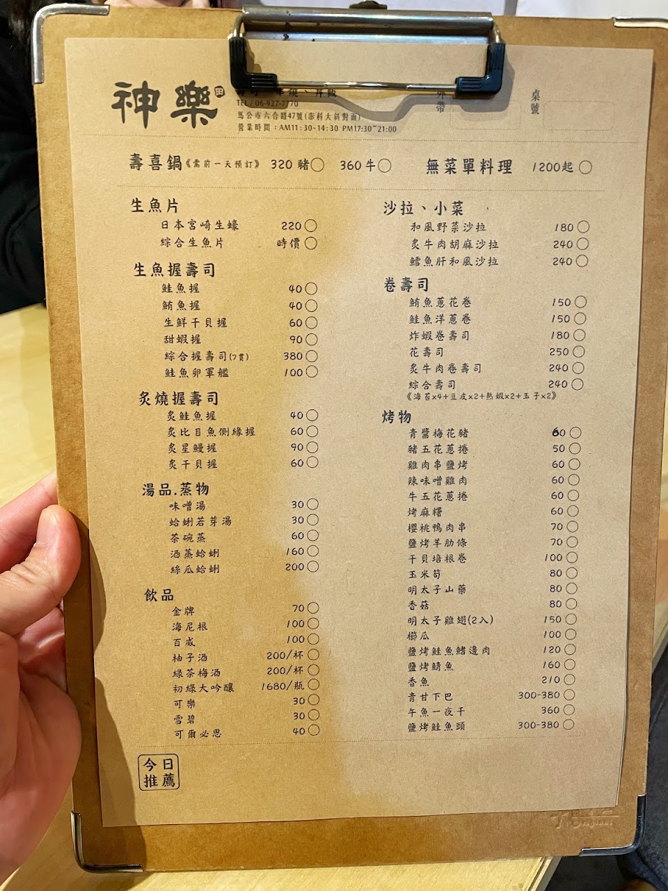 —生魚/炙燒握壽司 —蛤蜊若芽糖 —茶碗蒸 —炙牛肉胡麻沙拉 —炸蝦握壽司 —花壽司 —剝皮辣椒雞翅 —明太子山藥 —櫛瓜 —烤麻糬 —牛/豬五花蔥捲 —雞肉串鹽烤 服務 內用 餐點類型 晚餐
