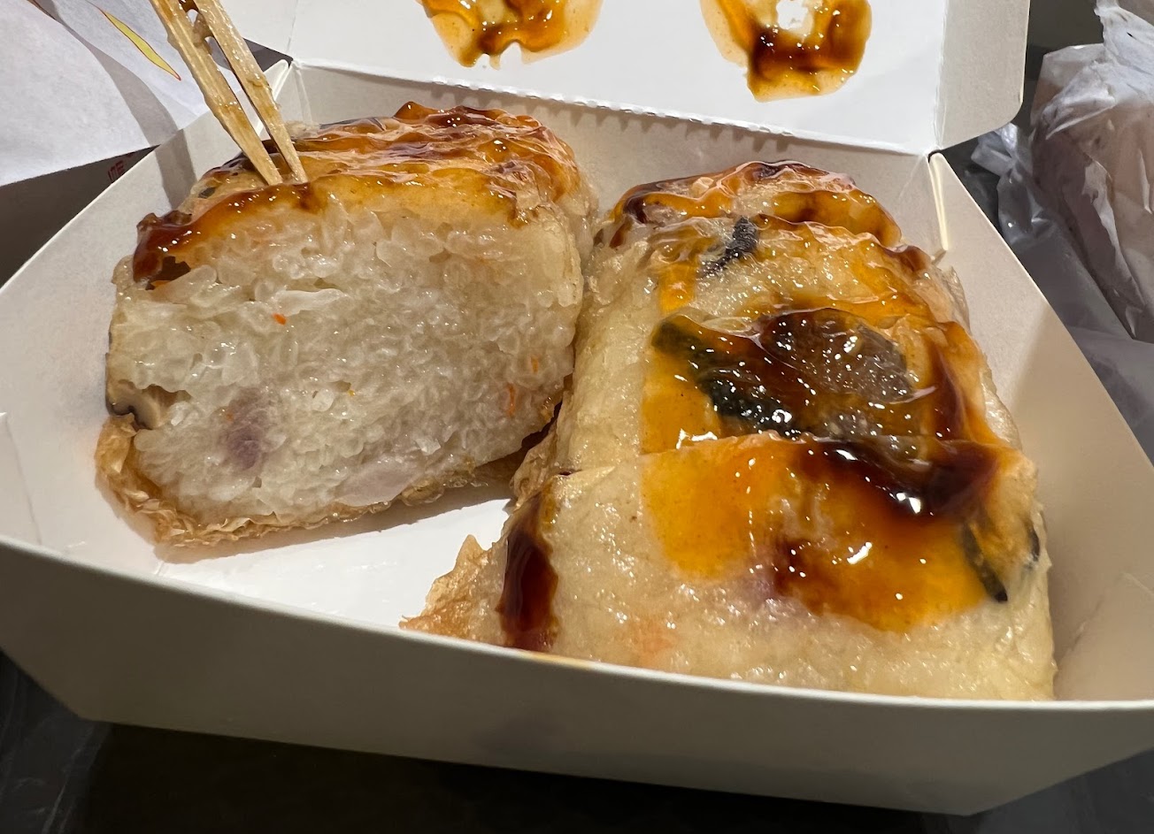 應該是有芋頭香菇等等,糯米本身QQ不爛口,外皮酥香,加甜辣醬好吃
