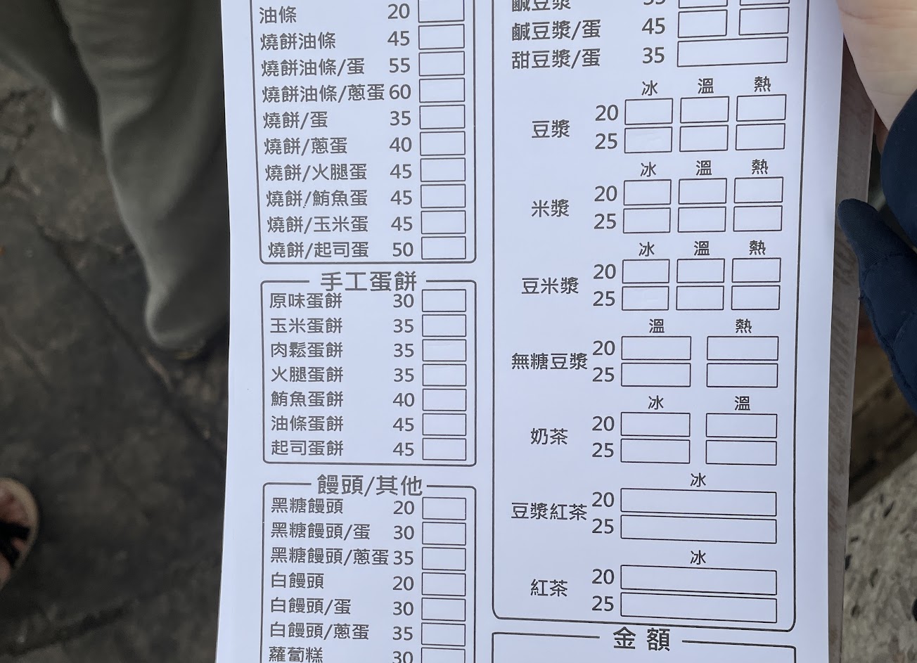 就像傳統的永和豆漿店,該有的品項都有,無論是在地人或觀光客都會去買,早餐時間需要排隊點餐、取餐,等候時間約20-30分鐘。
