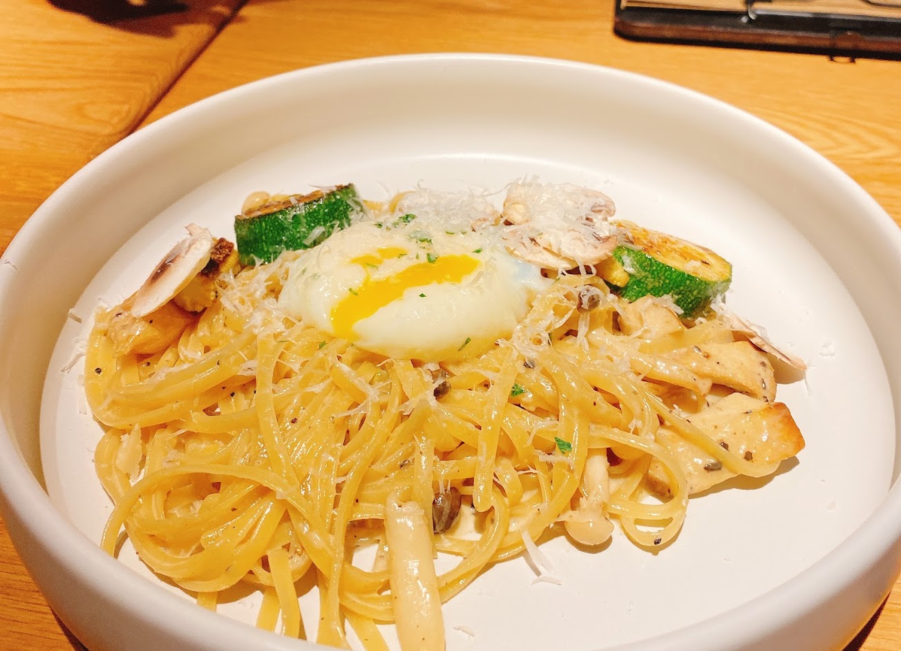 細扁麵頂上有顆水波蛋,以往用刀叉慢慢的切開一道小縫,金黃蛋液隨著破口緩緩流溢而出,但今天的熟度似乎有點過了一點點,不過瑕不掩瑜,蛋液流入麵裡能增添麵體不同層次,搭配依附在麵體上的白醬及松露,松露香氣、濃郁奶香加上柔順的麵條,整體十分好吃不膩口,而這道建議趁熱品嚐,口感較佳喔!